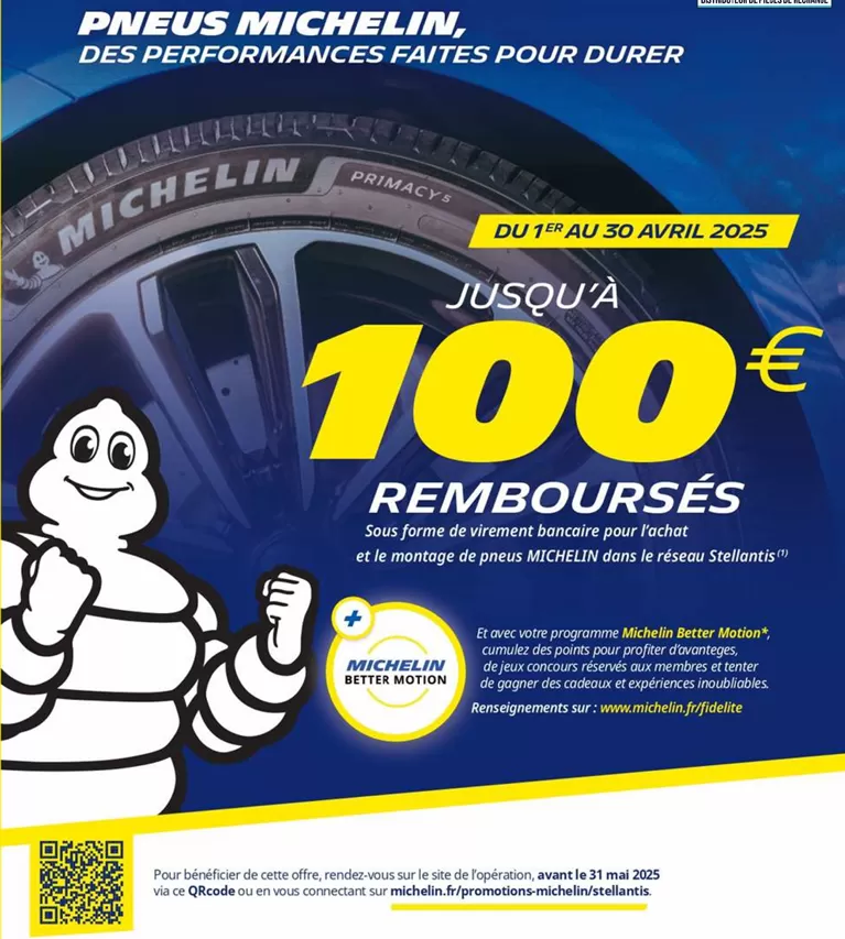 Dans votre garage des Fontaines au mois d'avril jusqu'à 100€ remboursés pour l'achat de pneus MICHELIN à Gueugnon.