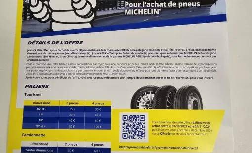 Dans votre garage des Fontaines du 7 octobre au 24 novembre jusqu'à 120€ remboursés pour l'achat de pneus MICHELIN à Gueugnon.